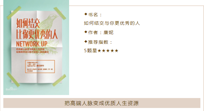 每個人都希望自己的學(xué)習(xí)、生活圈中能接觸到那些比自己更優(yōu)秀的人,讓自己變得更優(yōu)秀。而實際上并非如人所愿,每天在期望著卻并未去行動,最終只會讓自己離優(yōu)秀越來越遠。并且悔恨時間過的太快,卻從未好好反思如何利用好當(dāng)下自己的亮點,及時抓住機會時刻關(guān)注可以與優(yōu)秀的人結(jié)交機會,亦或者不斷提升自己的各方面能力,讓自己變的更優(yōu)秀.我們在日常的人脈搭建中,時常會進入“不敢”“不愿”“不會”的三大誤區(qū),是什么情況又該如何解決呢?不敢,是因為我們不夠自信,特別是向上結(jié)交。常常認為別人比我們優(yōu)秀的多,我們不敢開口,錯失機會。那就是要解決我們不自信的問題,如何讓自己變得自信,這是一個大話題。可針對我們不自信的方面(口語表達、邏輯分析等)找出自身的原因,并找到解決的方法。另外這本書,我比較深刻的地方是,一個人不管是事業(yè)的成功還是生活的歡樂,80%歸因于和別人相處,20%才是來自自己的心靈。我也像作者康妮提到那樣一類人一樣,在手機通訊錄里躺著很多聯(lián)系人名字和號碼,有好多我真的想不出都是誰,長什么樣子,包括朋友圈一樣,這些聯(lián)系人都是我們?nèi)粘?梢跃S護或者找到學(xué)習(xí)亮點的人。通過這本書的學(xué)習(xí),讓我認識到,一定要學(xué)會管理自己的聯(lián)系人,使他們成為自己的深度好友,還要學(xué)會連接優(yōu)秀的人,不過,了解結(jié)交更優(yōu)秀的人的方法和技巧,只是改變的第一步。要想成為人脈達人,還要在實際生活中刻意練習(xí),及時總結(jié)經(jīng)驗教訓(xùn)。