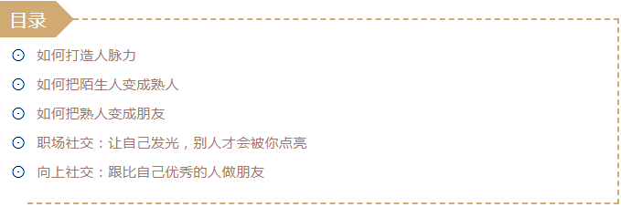 你認識誰比你知道什么更重要,愿意為你搭橋、為你背書、助你成功這才是真正有意義的人脈。保有一顆孩童般的好奇心,對世界、對他人真正的感興趣,渴望通過人和人的交往看到更廣闊的的世界,通過對人的深入了解而認識他們的本真。真誠、溫暖是敲門磚。把你的真誠用言語、行動,傳達給對方,讓對方感受到你的光和溫度,被你吸引。為他人創(chuàng)造價值是引路燈,做事絕不要從利己和功利的角度出發(fā),而是首先想到如何為對方創(chuàng)造價值。